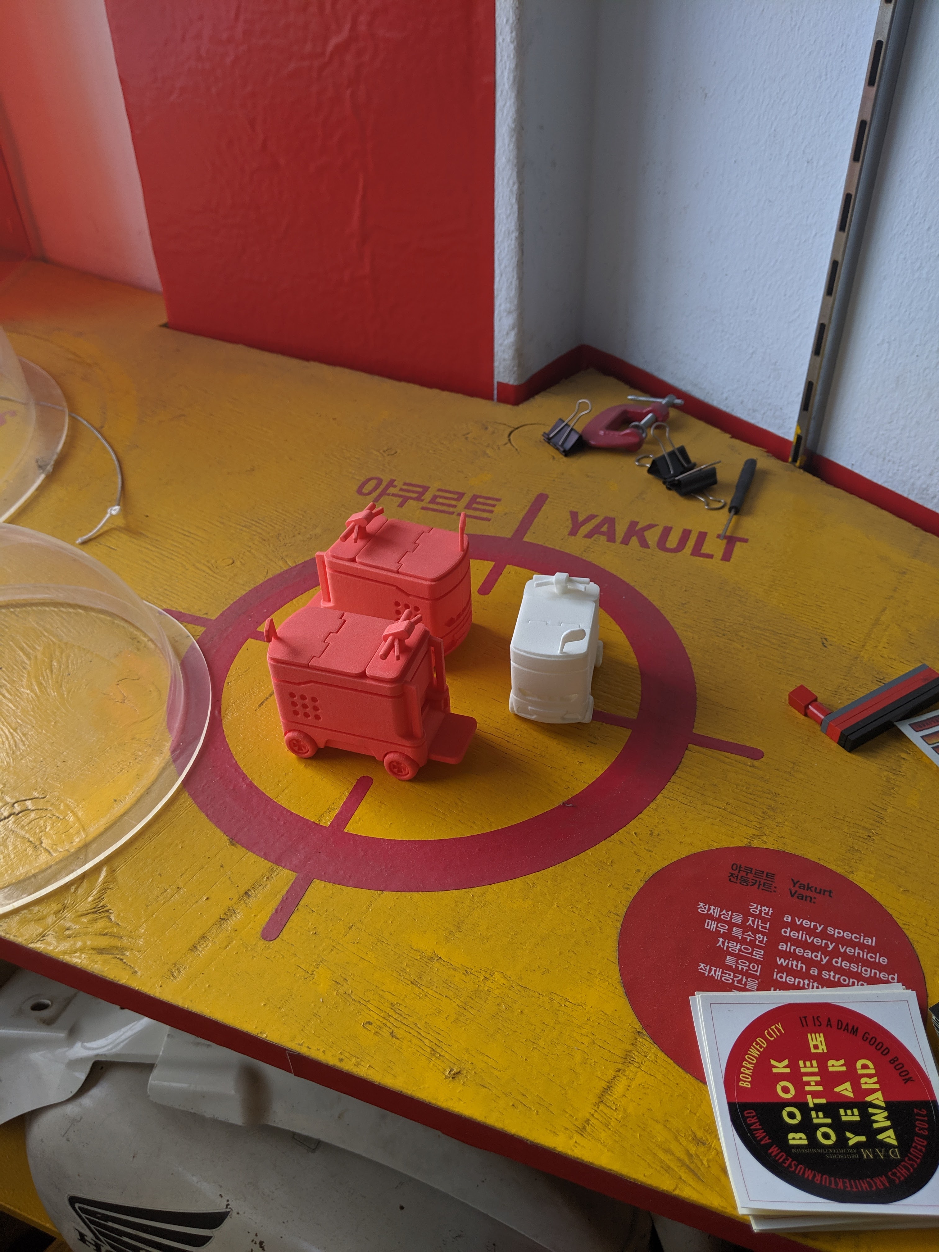 The Motoelastico practice had carried out design studies to model and 3D print the various modes of transport within the neighbourhood. Above was their motorcycle study and below for something that immediately caught my eye – the Yoghurt cart. A cart for yoghurt just sounds mad. How so? Here was one of my learning points for the day. Yoghurt is a big thing to Koreans (and is also popular in Japan where Yakult was invented). It’s a daily snack consumed by almost everyone. These carts and “Yoghurt Ladies”, who pilot them, whizz about in and near to the Maker districts delivering mid-morning and mid-afternoon yoghurt drinks to the workers and business owners. The density of customers and the design of the carts allows sales to happen down narrow walkways, pavements and routes through the neighbourhood. This relationship between density and food and drink delivery reminded me once of seeing someone in Istanbul in a similar district delivering hot tea to workers and shopkeepers along a street from a hand-pushed cart.