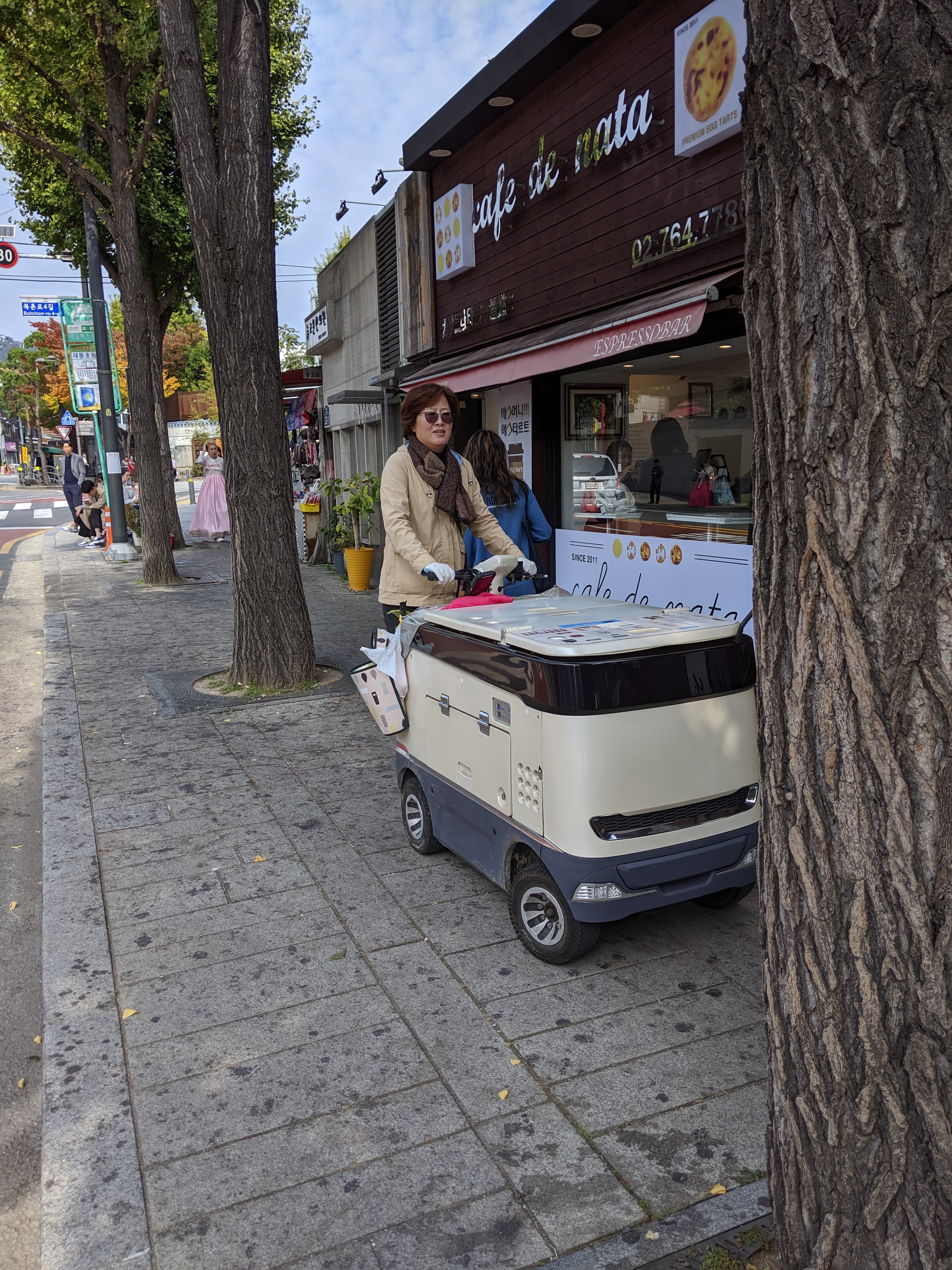 So once we had discussed all things architectural in Seoul (learning conveniently there was an Architecture festival just starting), I bid my goodbyes and then went on the hunt for a yoghurt cart. I just had to see one now that I had been told they were very Korean. So that afternoon my eyes were peeled. Sure enough within barely an hour I spied one. They appeared to be electrically powered and the driver stood on a platform at the back of the cart which had four wheels, the front pair steerable like a car. I was so pleased I saw one for real. Two days later in Busan I saw another cart going about in another market setting, but this one had its own rather fetching umbrella! (second picture below). Clearly this sort of vehicle is suited to the very permeable, intricate, dense urban environment which provided sufficient customers who are willing to pay for the product to be delivered to their premises.